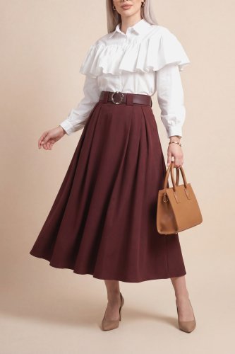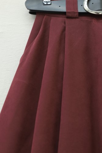 Kalın Kemerli Önü Pileli Yan Cepli Fermuarlı Tivil Etek Bordo
